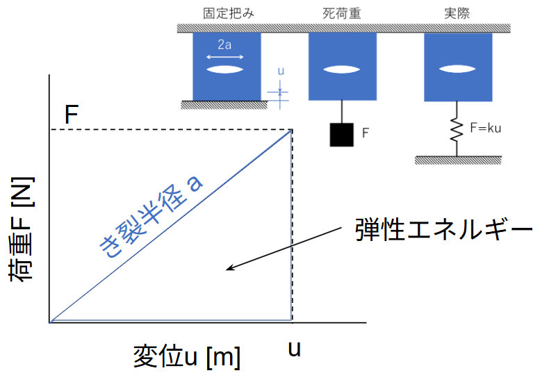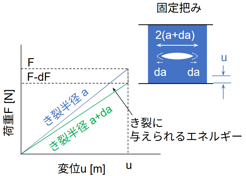 変位 u を一定に保ったまま、き裂が伸びると、試験片の剛性は低下します。その結果、必要な力 F は小さくなります。