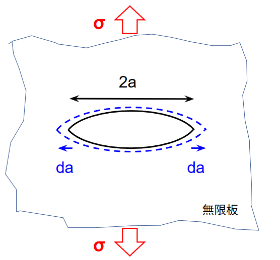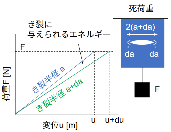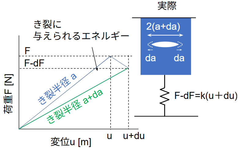 このとき外力は、「き裂が伸びた分だけ、追加の仕事をする」ことになります。一方で、弾性ひずみエネルギーの増減も同時に起こります。