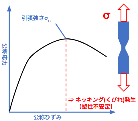 言い換えると、材料の「加工硬化(応力が増える力)」と、断面減少による「荷重低下の力」が釣り合えなくなった瞬間に、変形が局所化してネッキングが始まります。