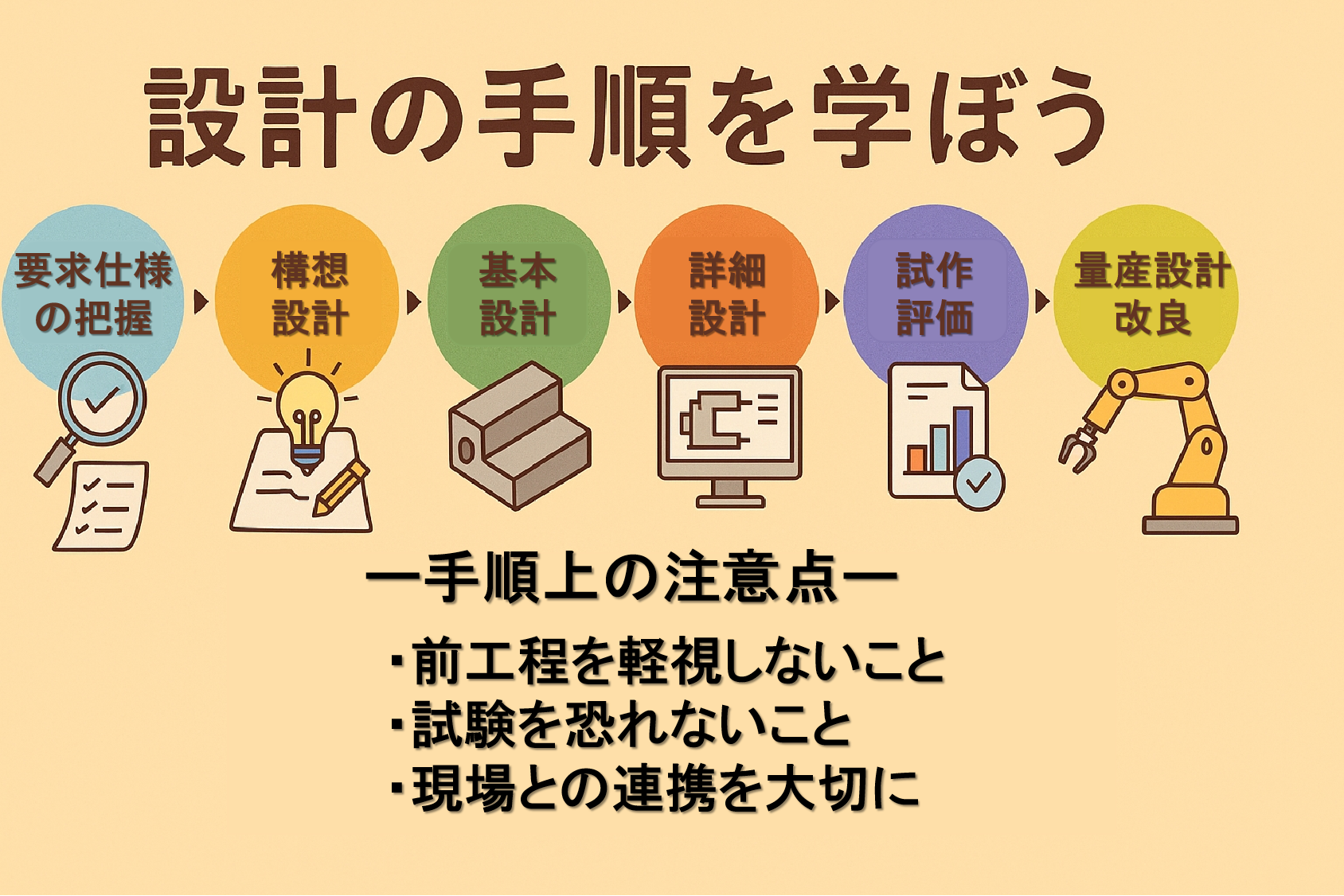 段階を踏みながら「要求を理解する → 構想を練る → 図面にする → 試す → 改良する」というプロセスを経て製品が完成します。